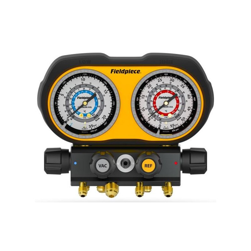 Analogové rozdělovače mají stejný robustní blok rozdělovače, jaký se používá v modelech SMAN® Digital Manifold. Známý vzhled vašeho digitálního rozdělovače Fieldpiece je nyní k dispozici i ve vaší základní analogové verzi.