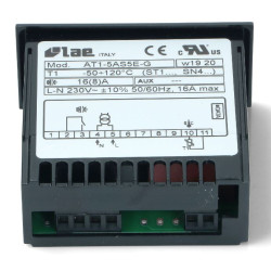 AT1-5AS5E-G. 230V, with 1 probe. Mounting dimensions: 71x29mm. 1 relay output. Protection: IP 55. Measuring range: -50° a +120°C.